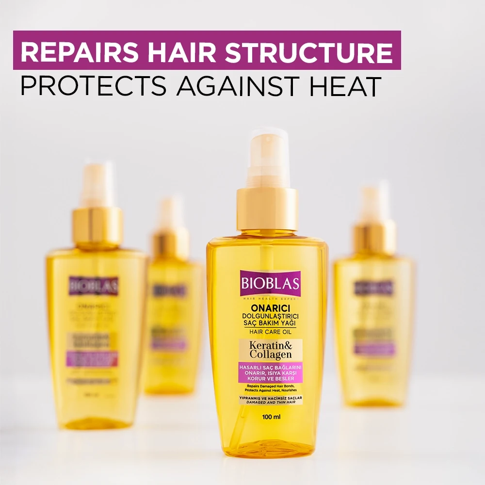 Enriched with keratin and collagen in its formula, Bioblas Repairing Thickening Hair Care Oil instantly affects damaged and dull hair. It repairs damaged hair bonds and strengthens the hair structure and prevents your hair by nourishing the hair strands without weighing it down. It adds volume and a silky softness to your hair. It supports a healthier, stronger and shinier appearance.